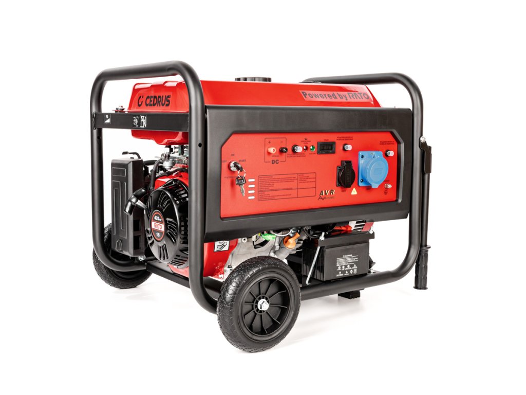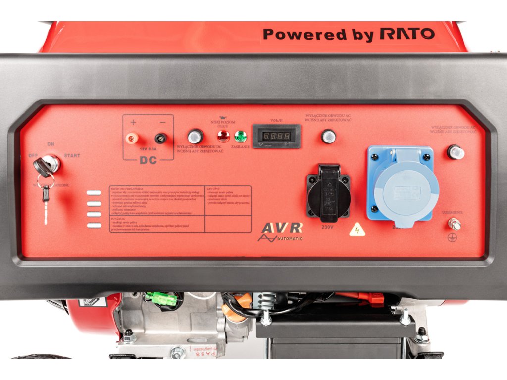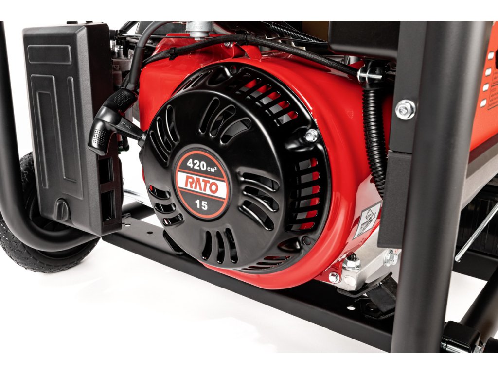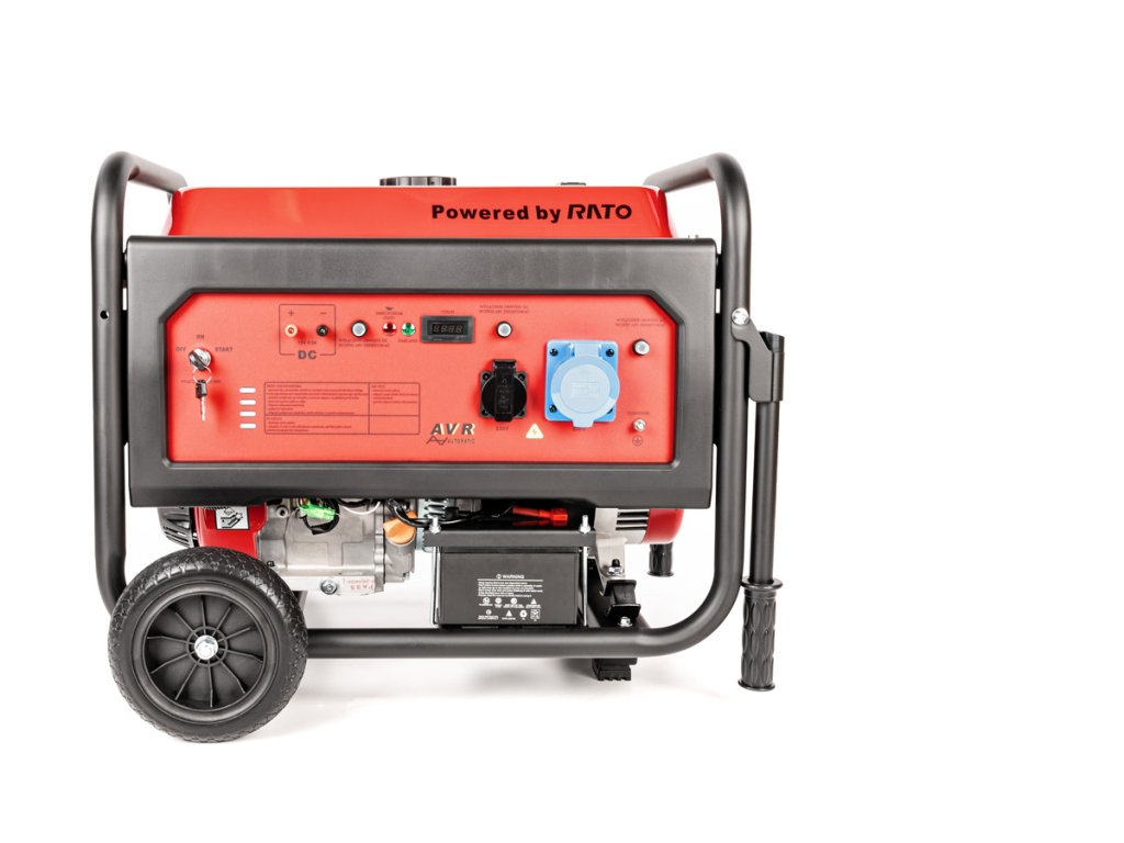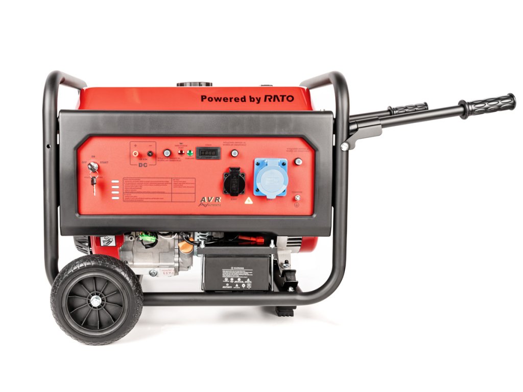 Leistungsstarker einphasiger Stromerzeuger mit Rato R420 Motor (420 cm³), einer maximalen Leistung von 6.000 W, Elektro- und Handstart, AVR-Spannungsregelung sowie Kupferwicklung des Alternators. Ideal für Haus, Werkstatt, Baustelle oder als Notstromquelle.