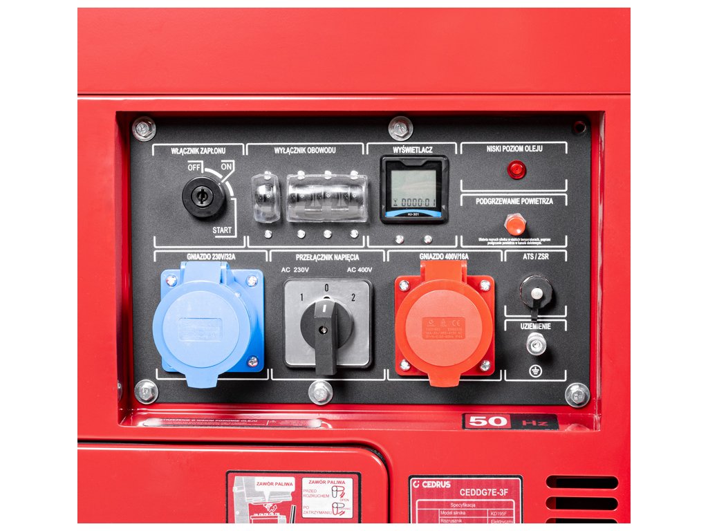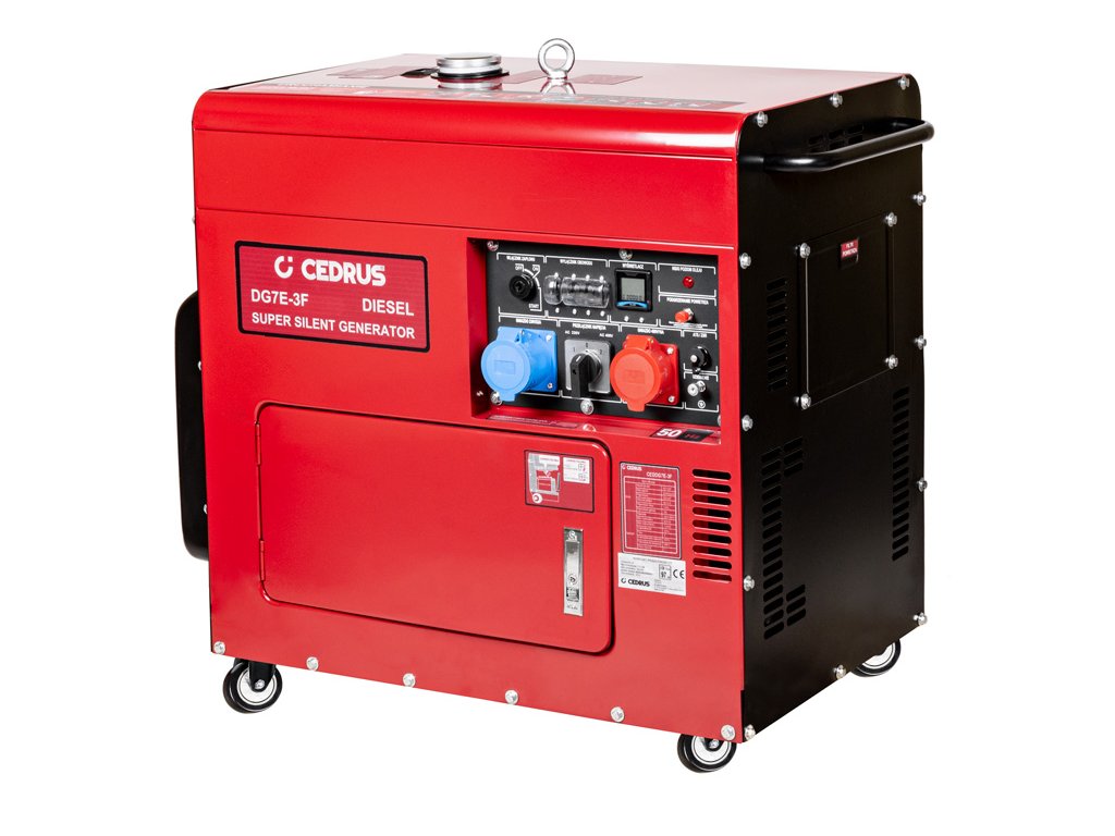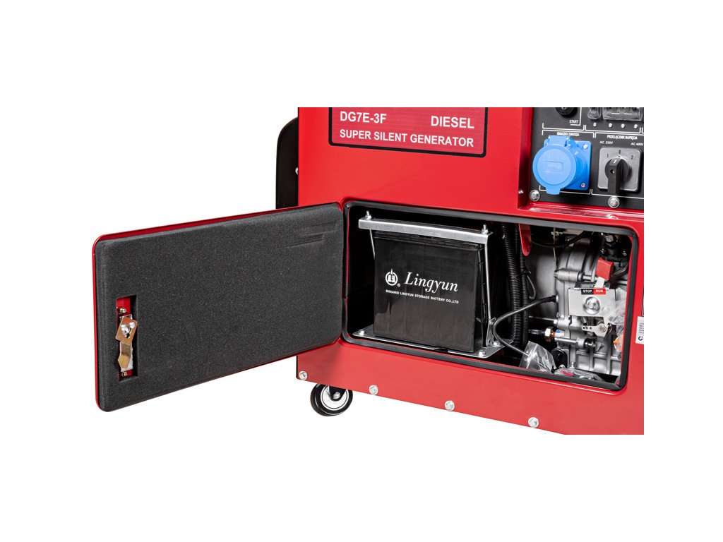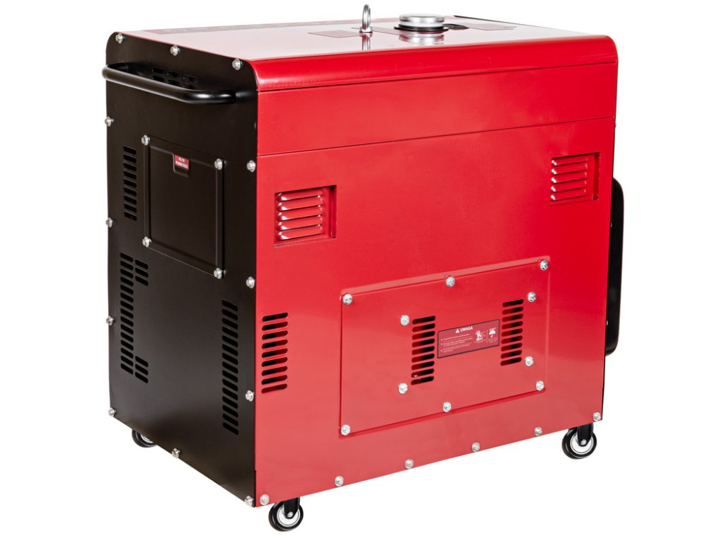 Professioneller dreiphasiger Dieselgenerator im schallgedämmten Gehäuse mit einer Leistung von bis zu 7,1 kW (3F), elektrischem Start, Kupferwicklung und AVR-Spannungsregelung. Geeignet als Notstromquelle für Einfamilienhäuser, Werkstätten, Unternehmen sowie Baustellen.
