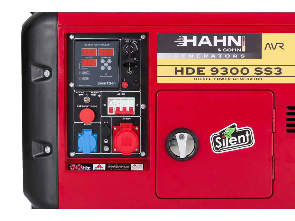 Hahn & Sohn HDE 9300SS3 ist ein kompakter Dieselgenerator mit geräuschgedämmtem (Silent-)Gehäuse, ausgelegt für den einphasigen und dreiphasigen Betrieb. Er bietet eine Leistung von 6,0 kW bei 230 V (1-phasig) oder 6,5 kW bei 400 V (3-phasig), elektrischen Start,Fernbedienung, Motorvorwärmung, die Möglichkeit der Zusammenarbeit mit ATS, eine stabile Spannungsregelung durch AVR sowie eine niedrige Geräuschentwicklung, wodurch er sich ideal als Notstromquelle wie auch für den professionellen Einsatz eignet.