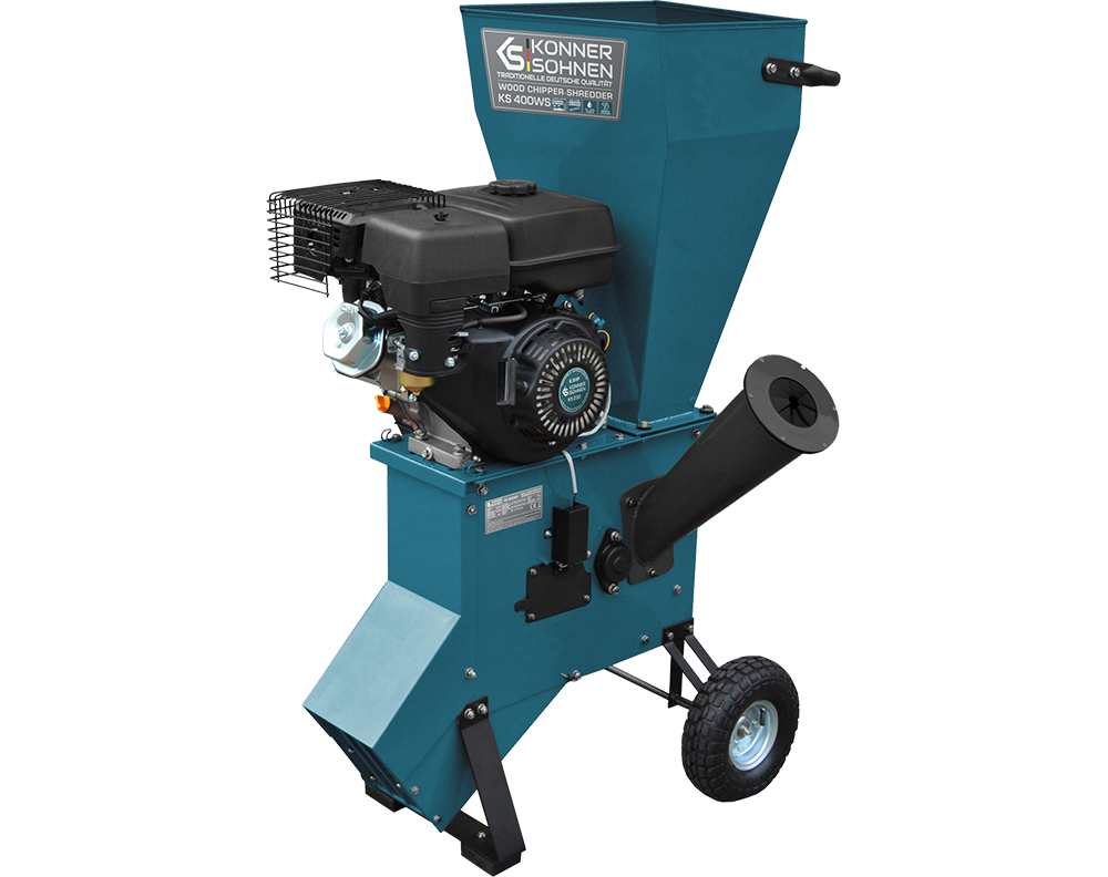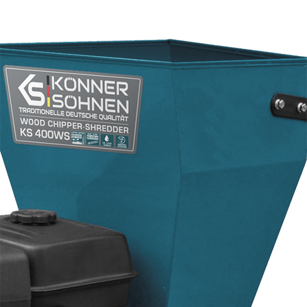 The KS 400WS garden wood chipper for branches and grass from the German brand "Könner & Söhnen®" is equipped with two feed hoppers for efficient processing of a wide variety of garden waste, such as dry and wet branches or soft waste, e.g. leaves, grass, straw, etc.