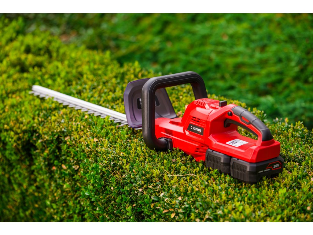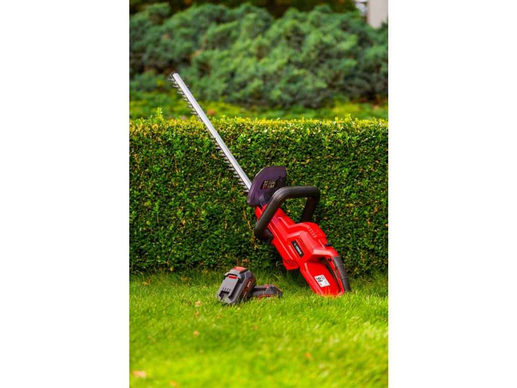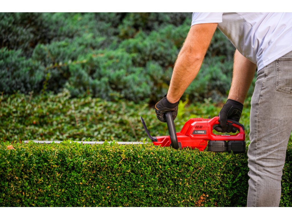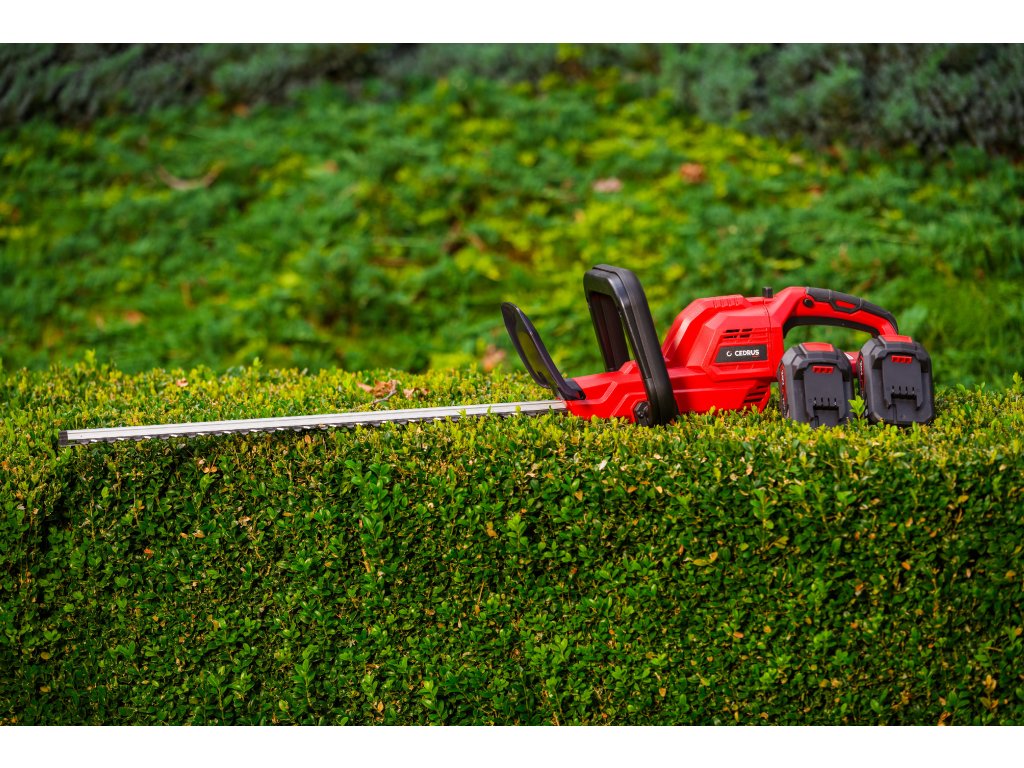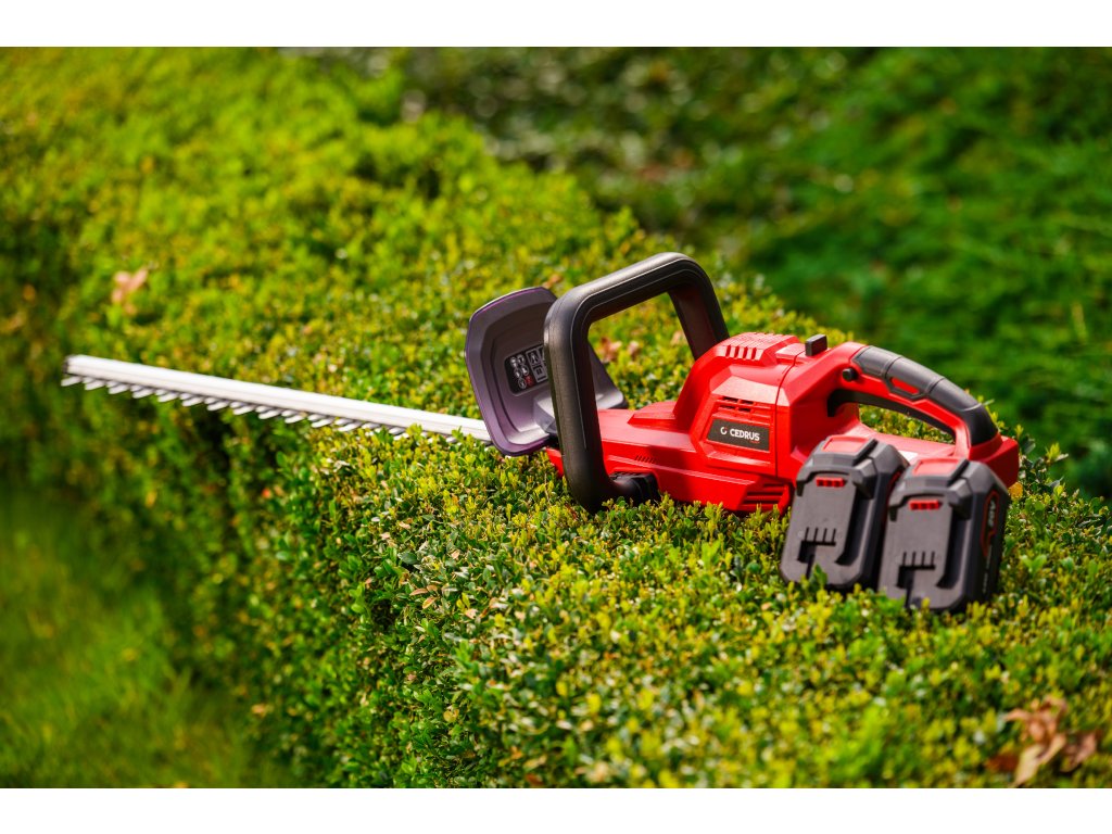 Leistungsstarke Akku-Hecken-schere Cedrus CEDHT520LIX2 mit zwei 20V Li-Ion-Akkus und einer Klingenlänge von 520 mm. Dank des ergonomischen Designs und des drehbaren Griffs ermöglichen sie eine einfache und komfortable Handhabung.