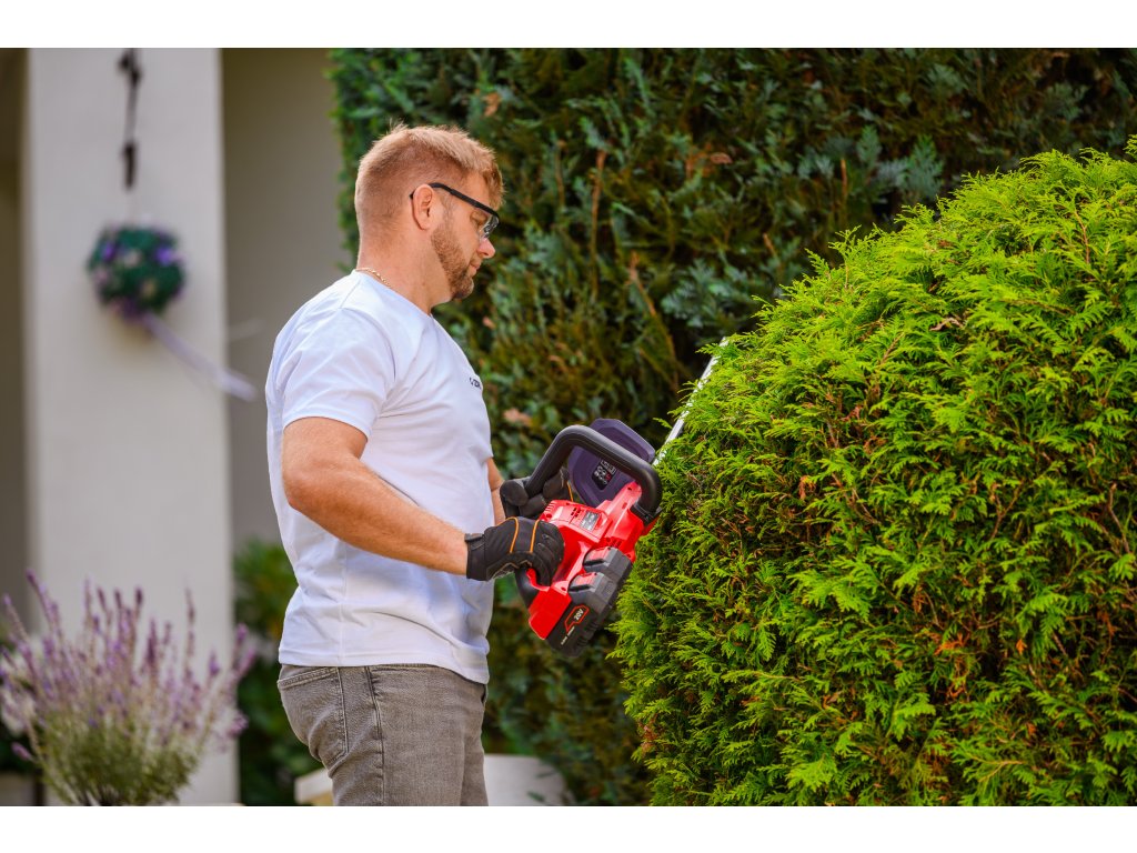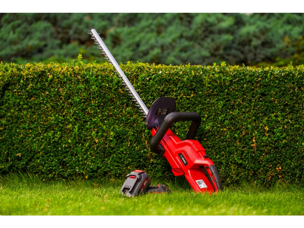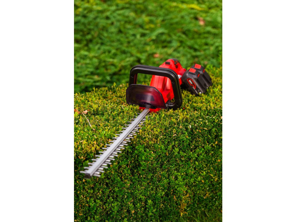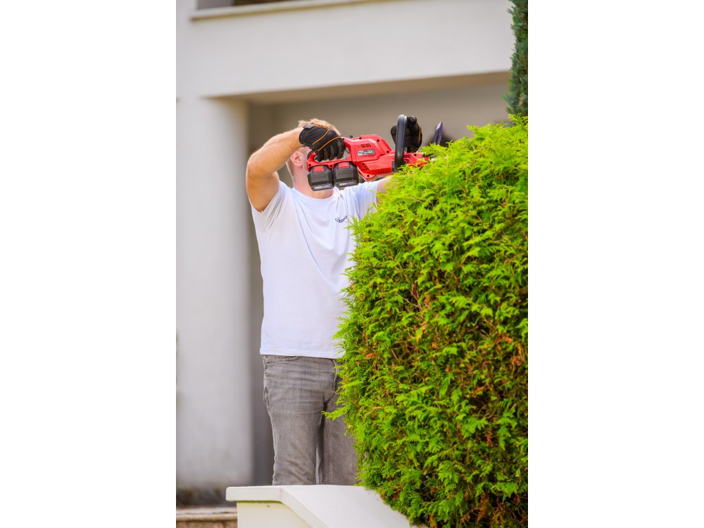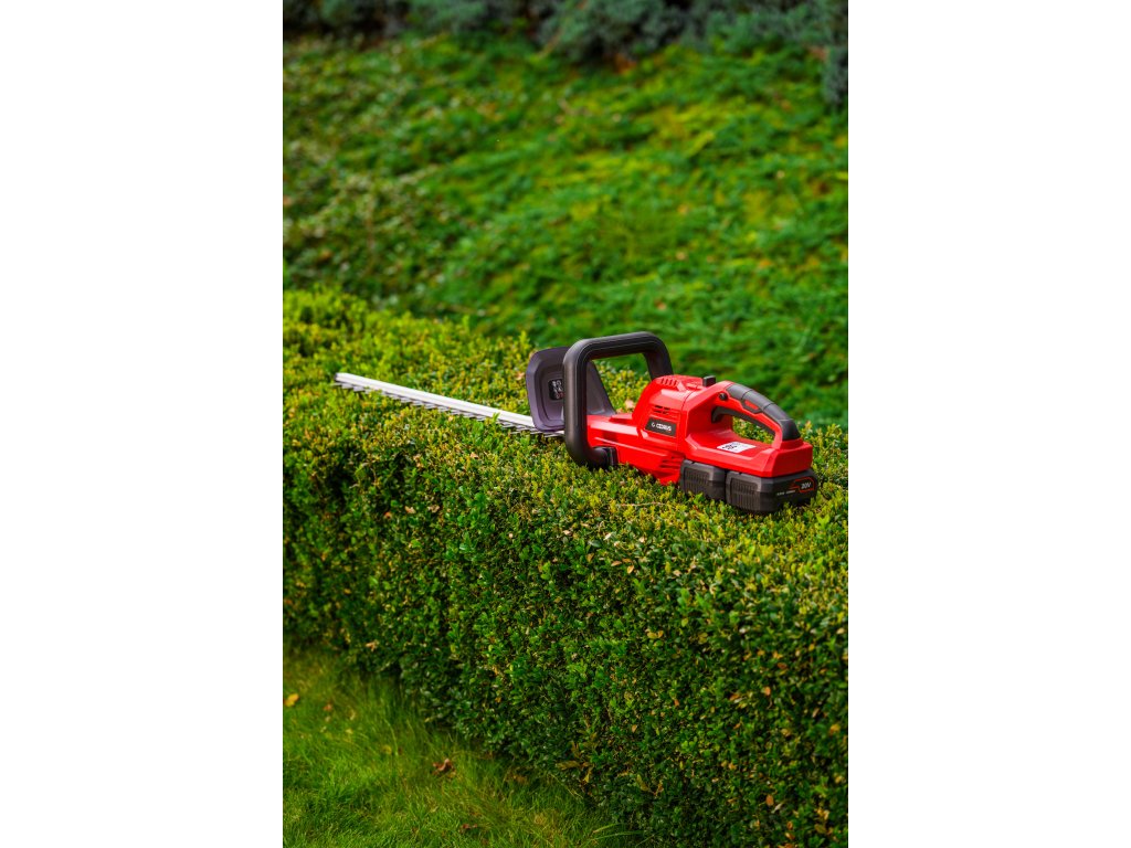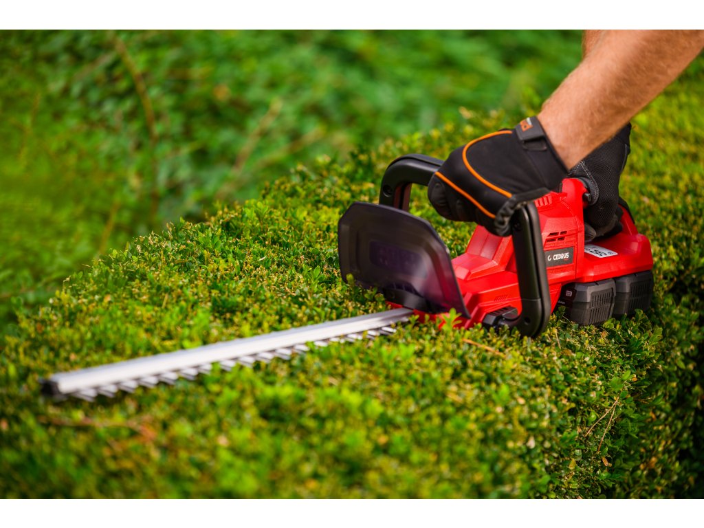 Leistungsstarke Akku-Hecken-schere Cedrus CEDHT520LIX2 mit zwei 20V Li-Ion-Akkus und einer Klingenlänge von 520 mm. Dank des ergonomischen Designs und des drehbaren Griffs ermöglichen sie eine einfache und komfortable Handhabung.