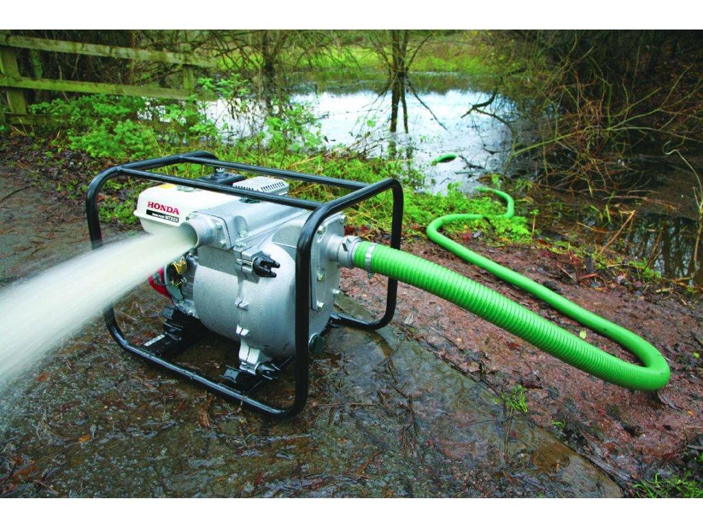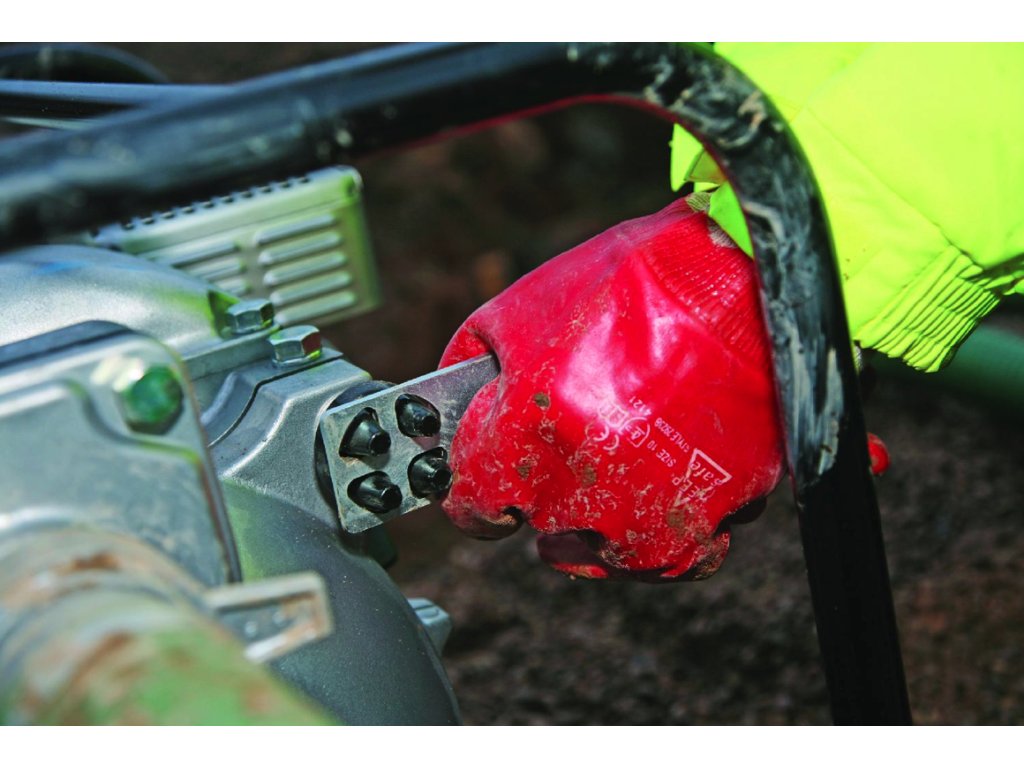 Modell einer kleinen motorisierten Schlammpumpe. Die äußerst robuste Sumpfpumpe wird von einem professionellen Motor der GX-Serie mit einfachem Start angetrieben, der in einem soliden Stahlrahmen aufgehängt ist. Eine anschraubbare „C“-Feuerwehrhalbkupplung kann angebracht werden, um einen Feuerwehrschlauch einfach anzuschließen.