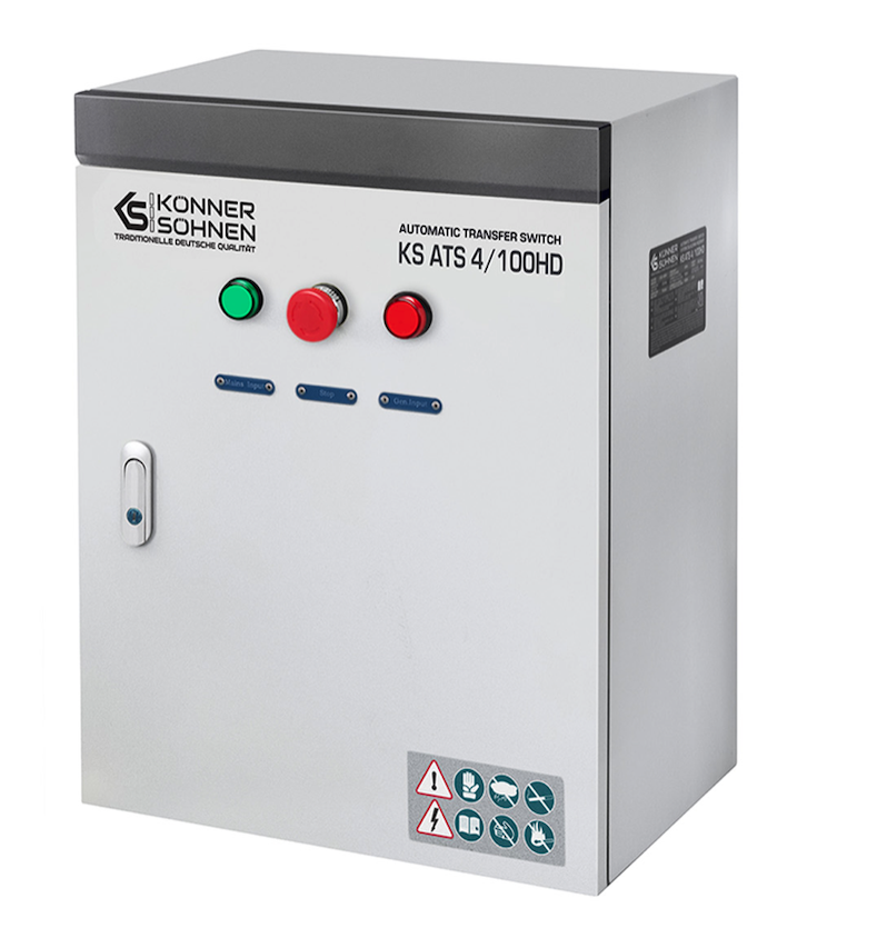 Das automatische Netzumschaltgerät (ATS) KS ATS 4/100HD von „Könner & Söhnen“ startet die Powerstation automatisch und schaltet die Last auf Notstrom um, wenn die Hauptstromversorgung ausfällt, stoppt die Powerstation beim Wiederkehren der Hauptstromversorgung und schaltet die Last zurück. Es eignet sich für Dieselaggregate von Könner & Söhnen. Die ATS-Einheit ist sowohl im automatischen als auch im manuellen Modus einsetzbar.