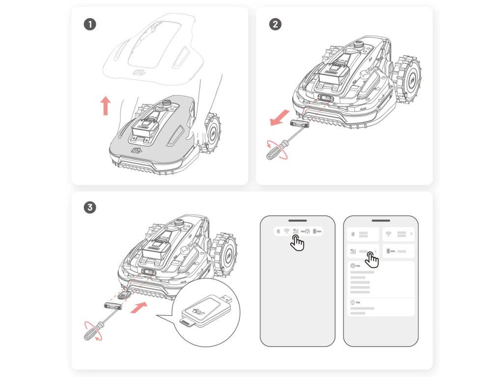 - Das Modul wird direkt im Mäher installiert und ermöglicht eine stabile Kommunikation mit der mobilen App. Dies ist besonders bei größeren oder abgelegenen Grundstücken von Vorteil, wo die Abdeckung des Heimnetzwerks nicht ausreichend ist.