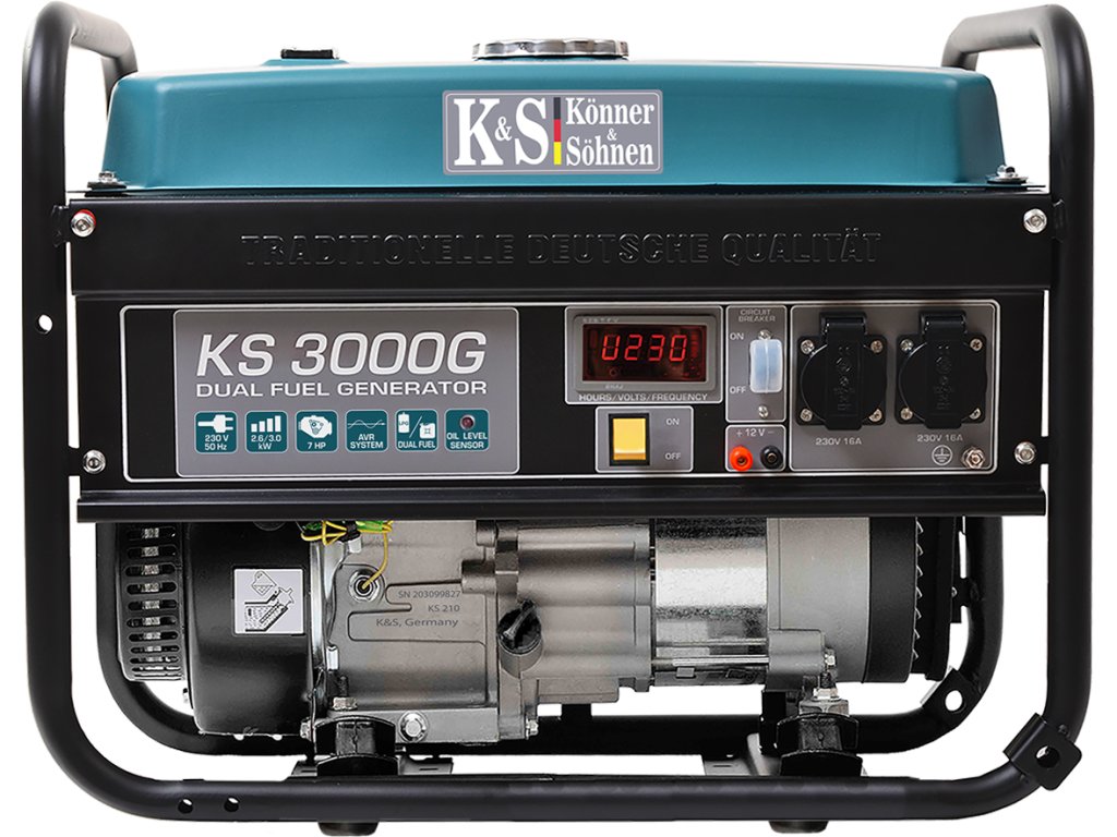 Der Generator KS 3000 G der Serie DUAL FUEL arbeitet mit Benzin oder Flüssiggas (Propan-Butan). Dank seiner Effizienz ist er umweltfreundlich, und der Gasbetrieb verlängert die Lebensdauer des Motors. Der leistungsstarke luftgekühlte Einzylinder-Viertaktmotor von K&S gewährleistet einen stabilen und zuverlässigen Betrieb des Generators.