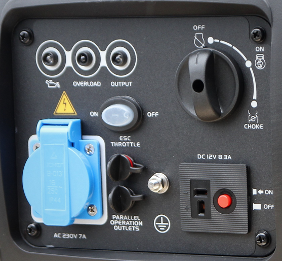 Eingebaute Steuerungseinheit mit einer Mikroprozessorsteuerung sorgt dafür, dass technische Abläufe des Generators mit stabiler Frequenz von 50Hz und Spannung 230V gesteuert und kontrolliert werden.