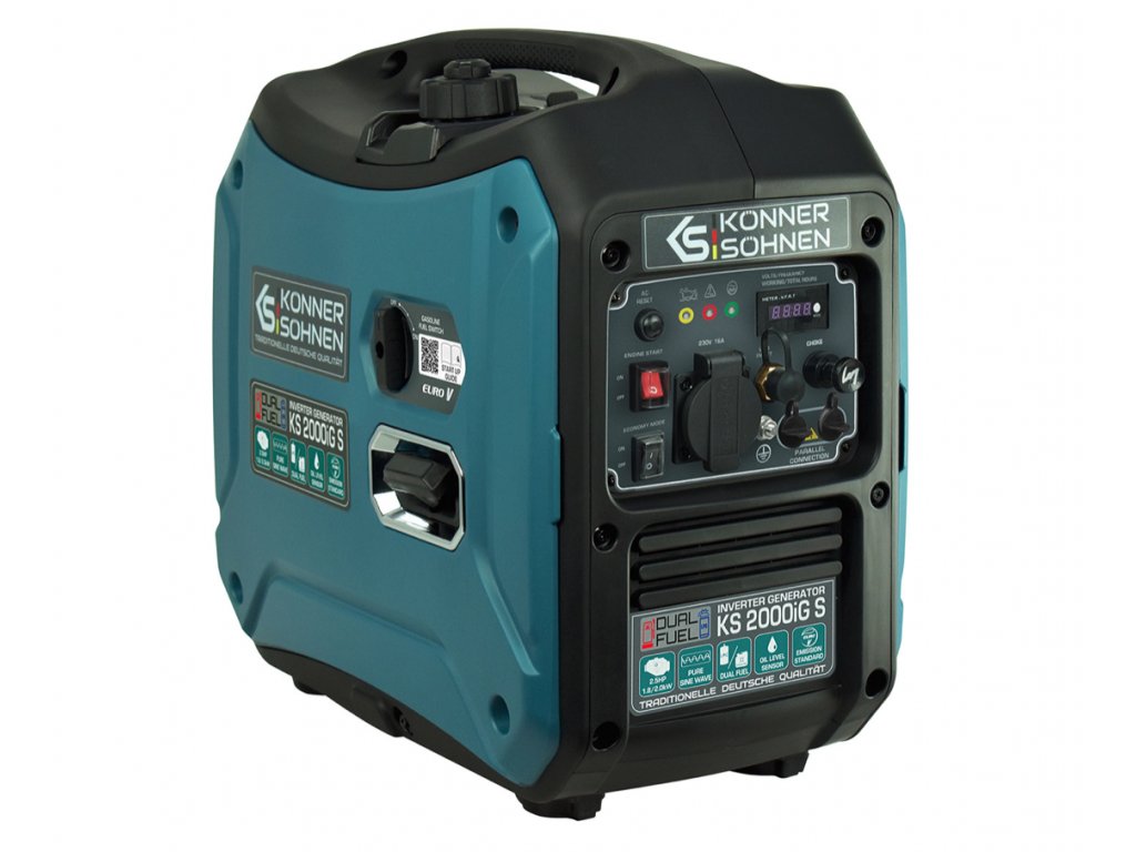 Der LPG/Benzin-Inverter-Generator KS 2000iG S der deutschen Marke „Könner & Söhnen“ in einem schallgedämmten Gehäuse dient als eine bequeme, tragbare und geräuscharme Energiequelle. Das Hauptmerkmal dieses Modells ist, dass es eine reine Sinuswelle des Stroms gewährleistet.
