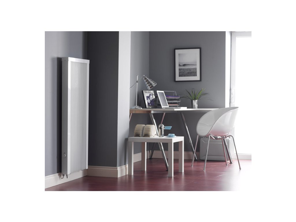 Der Staukessel hat einzeln verschweißte Lamellen und seine Oberfläche ist pulverbeschichtet. Farbe weiß RAL 9003, Tiefe nur 70 mm. Der stufenlos einstellbare Einbau-Thermostat regelt die Raumtemperatur. Anschlusskabel 1,5 m mit Stecker, 230 V ~, inkl. Standfuß.