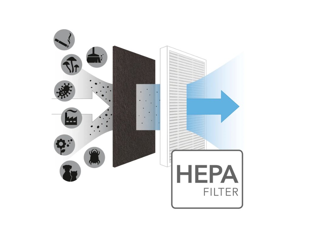 Der Synthesefaserfilter dient als Vorfilter für leichte bis mittlere Gerüche und gröberen Hausstaub. Im zweiten Vorgang werden die Pollen, Allergene, Feinstaubpartikel und Schimmelpilzsporen bis zu einer Größe von 1,0 Mikrometer dank des effizienten HEPA-Filters bis zu 95 % eliminiert.
