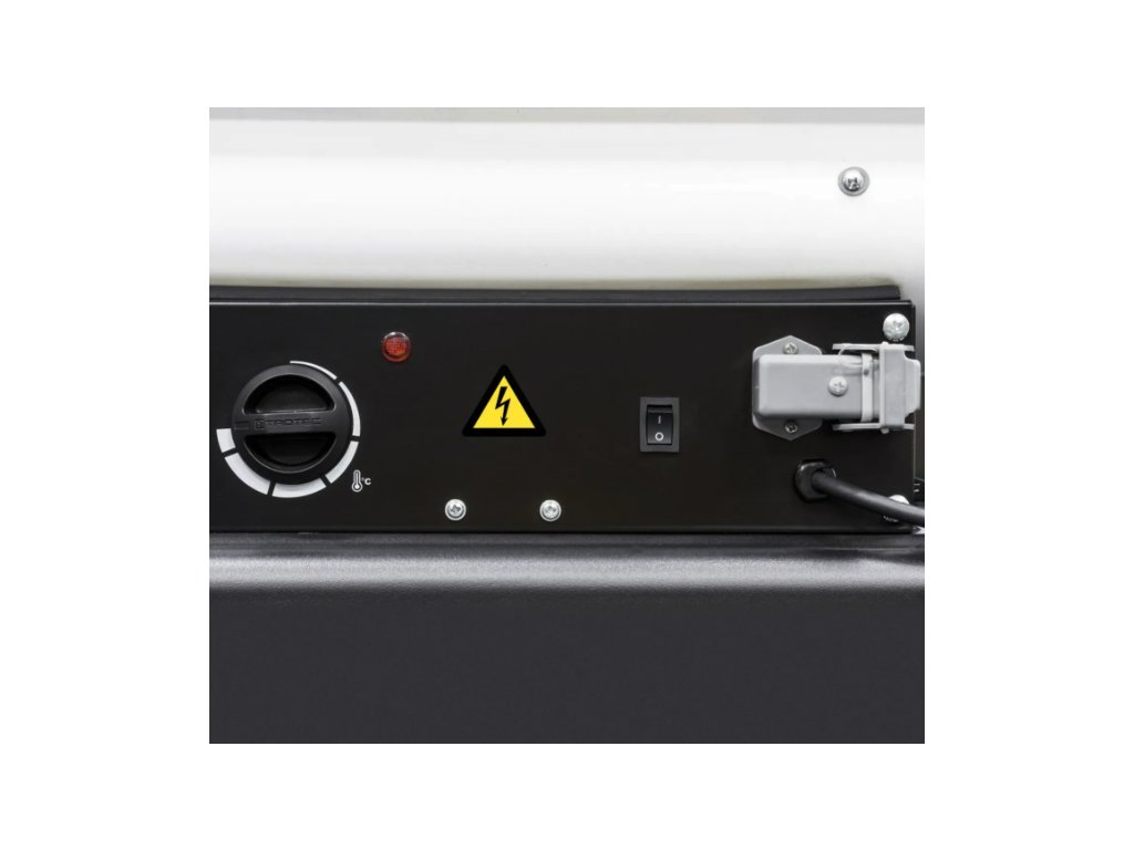 Neben dem serienmäßig integrierten Thermostat zur Temperatursteuerung verfügt das IDE 20 über einen zusätzlichen Anschluss für ein externes Thermostat, welches optional mitgeliefert werden kann, falls das Ölheizgebläse in bis zu 25 Meter Entfernung vom zu beheizenden Bereich aufgestellt werden soll.