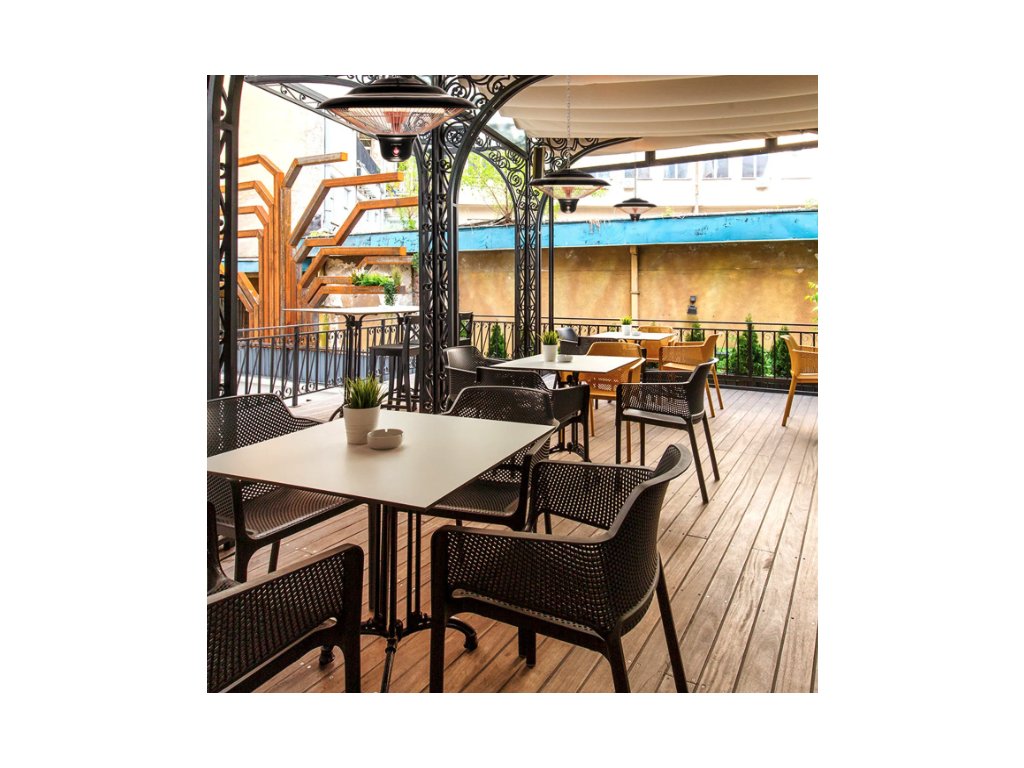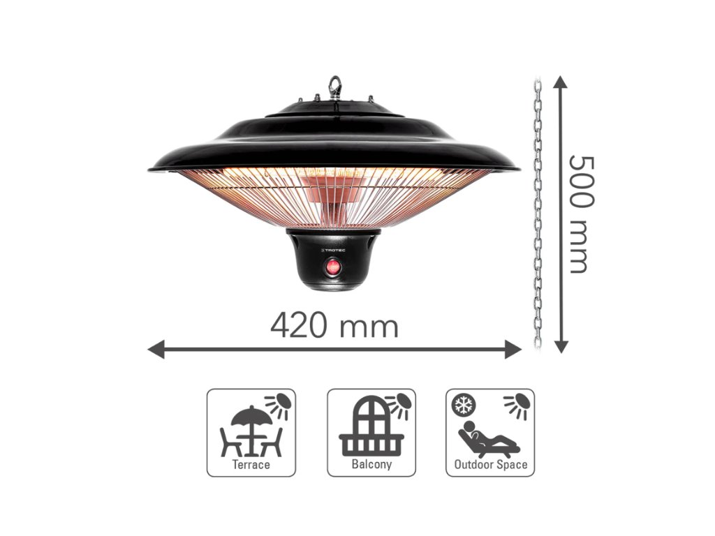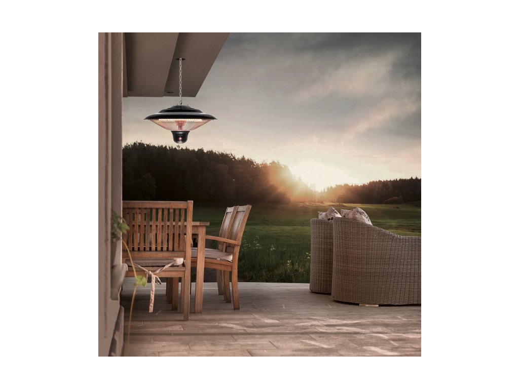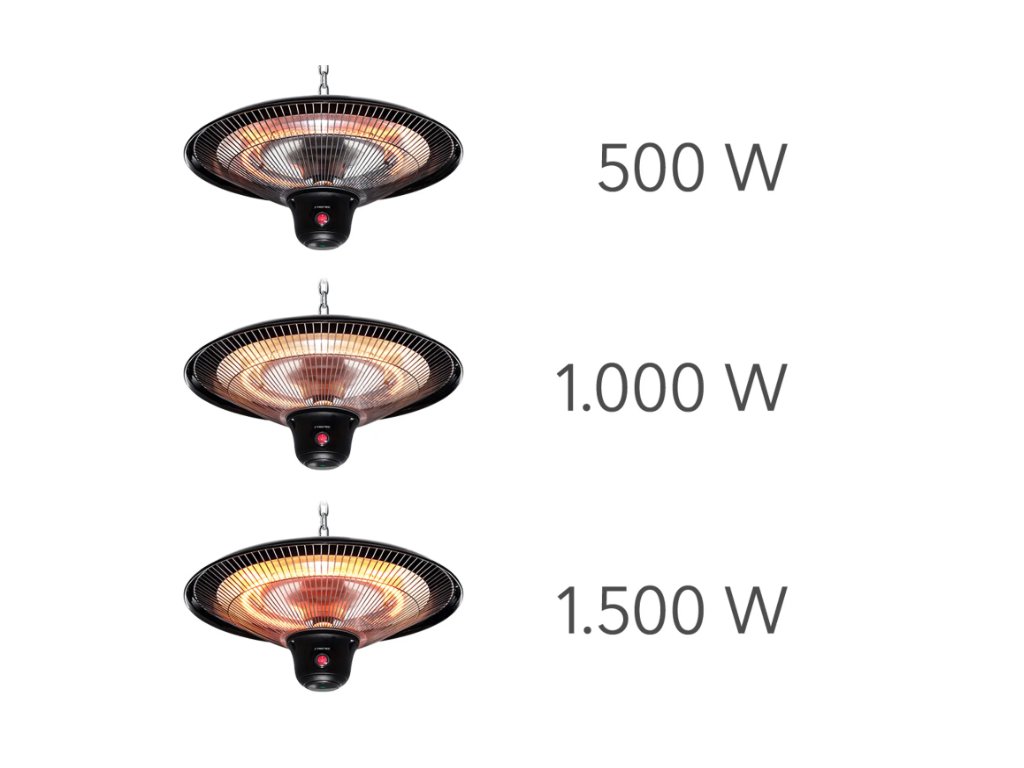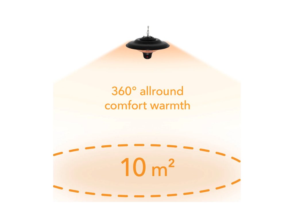 Der 1,5 kg leichte Infrarotstrahler lässt sich mit der im Lieferumfang enthaltenen 50 cm langen Edelstahlkette auch ohne Einsatz eines Technikers mit wenigen Handgriffen platzsparend an der Decke, an Terrassenüberdachungen oder Zeltgerüsten montieren. Neben seinem elegant schwarzen Design punktet der Deckenstrahler mit einer leistungsstarken wie energiesparenden Infrarotheiztechnik. Die bis zu 1.500 Watt starke Carbon-Infrarotröhre spendet ohne Vorheizen eine in alle Richtungen gleichmäßig abgestrahlte Sofortwärme für einen Bereich von ca. 10 m². Diese angenehme Infrarotwärme ist sofort auf der Haut spürbar, ohne zuerst die Umgebungsluft zu erwärmen und komplett ohne störende Gerüche oder Geräusche.