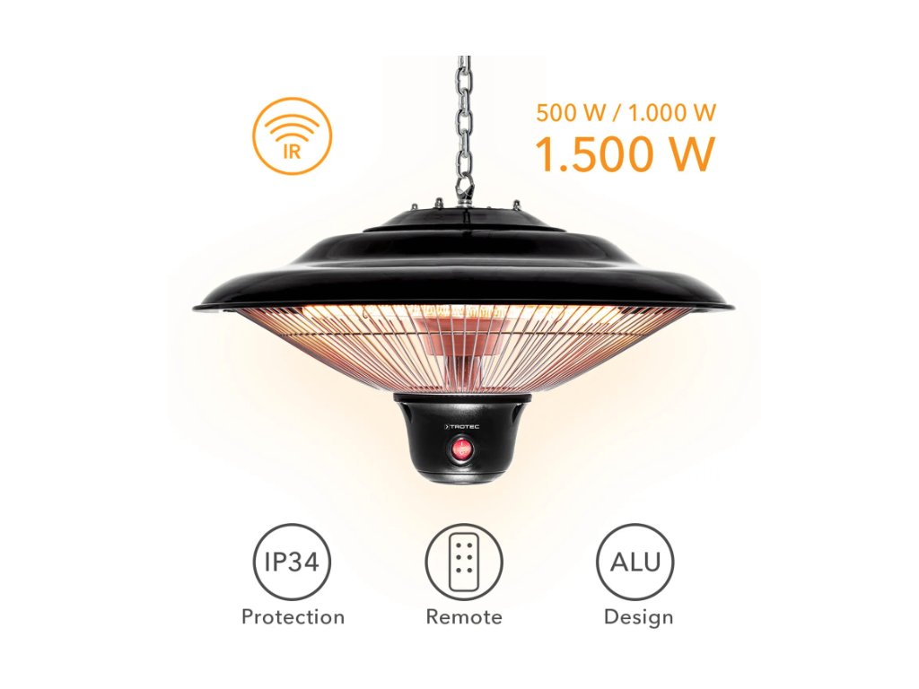 Wo auch immer im überdachten Außenbereich eine schnelle und angenehme Sofortwärme benötigt wird – die vergleichsweise blendfreie Carbon-Heizspirale des IR 1500 SC liefert auf Knopfdruck behagliche Infrarotwärme in drei schaltbaren Heizstufen (500 W / 1.000 W / 1.500 W). Die Steuerung der Heizintensität erfolgt bequem über die mitgelieferte Fernbedienung.