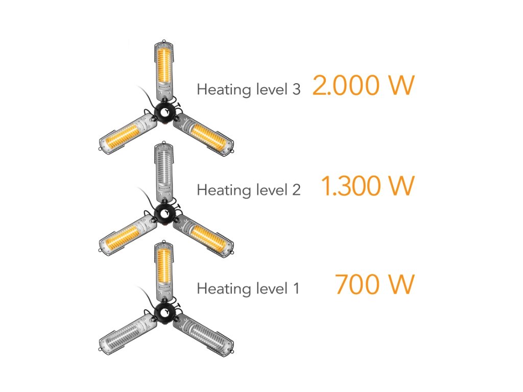 Das durchdachte Design des IR 2005 SC überzeugt mit Blick auf Ästhetik, Funktionalität und Sicherheit. Der aus wetterfestem Aluminium gefertigte und nach Schutzklasse IP34 vor Spritzwasser geschützte Schirm-Heizstrahler ist mit wenigen Handgriffen an der Schirmstange (passend für Ø 2,5 cm - 6 cm) montiert. Schutzgitter über den Heizflügeln verhindern den direkten Kontakt der Schirmbespannung mit den Heizelementen. Die rutschfeste Befestigung des IR 2005 SC erfolgt werkzeuglos über eine Drehknopf-Feststellschraube. Der Schirm-Infrarotstrahler lässt sich flexibel nach gewünschter Höhe oder Position an der Schirmstange fixieren. Sein optisch herausragendes Propellerdesign mit vertikal um 90° verstellbaren Heizarmen, die sich zudem stufenlos ein- und ausklappen lassen, garantiert eine intensive 360°-Rundumwärme in alle Richtungen. Die Beheizungs-Intensität der drei Heizelemente kann je nach Bedarf eingestellt werden. In der ersten Heizstufe (700 W) schaltet sich ein Heizarm an, in der zweiten Stufe (1.300 W) zwei Heizarme und in der dritten Stufe (2.000 W) alle drei Heizarme. So lassen sich je nach Personenzahl punktuell einzelne Sitzplätze oder großflächig ganze Sitzbereiche unter dem Schirm mit wohltuender Wärme versorgen. Die Strahlungswärme kommt stets dort an, wo sie auch wirklich benötigt wird. Dadurch heizt der Schirm-Strahler IR 2005 SC äußerst effizient, um Flächen bis 15 m² ausreichend mit gemütlicher Infrarotwärme zu versehen.