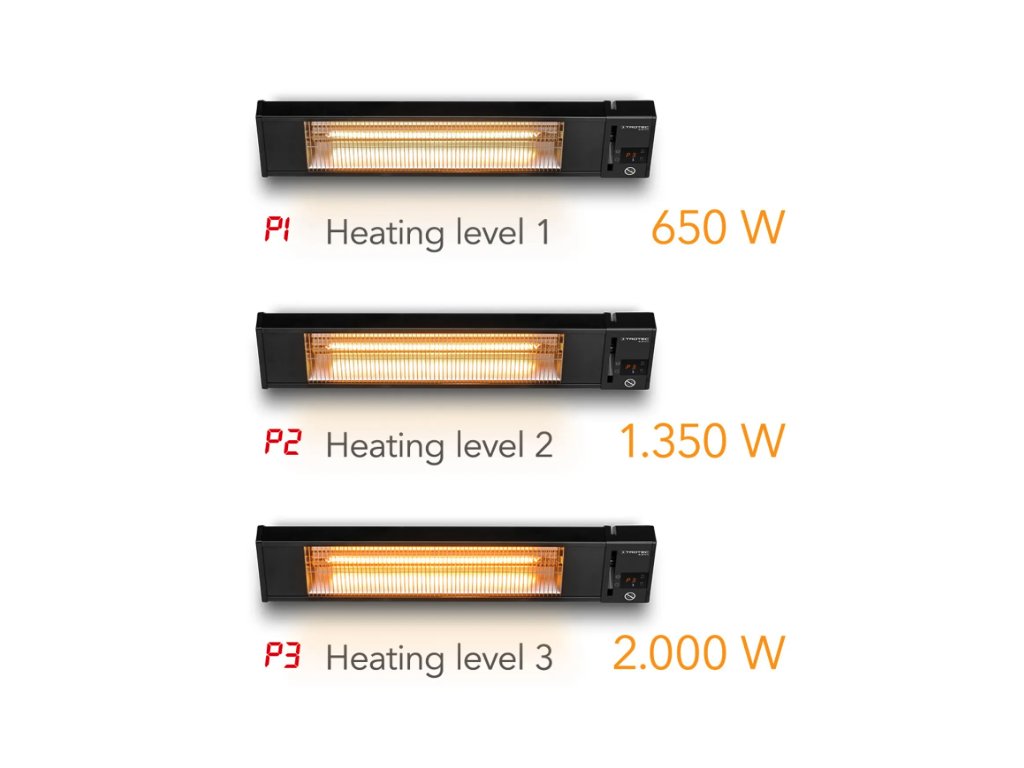 Die hochwertige Carbon-Infrarotröhre des 735 mm langen Heizstrahlers verströmt unmittelbar nach dem Einschalten eine angenehm-spürbare Wärme auf der Haut, ganz ohne Aufwärmphase und noch bevor eine wirkliche Rotfärbung des Heizelements eintritt. Ein weiteres Kennzeichen von Carbon-Röhren ist ihre lange Lebensdauer, denn sie erreichen eine Betriebszeit von über 10.000 Stunden. Zur Anpassung der Wärmeintensität verfügt der IR 2010 S über drei Heizstufen mit bis zu 2.000 Watt, schaltbar über das integrierte Bedienfeld oder die mitgelieferte Fernbedienung. Auf der LED-Anzeige ist die eingestellte Leistungsstufe (P1: 650 W / P2: 1.350 W / P3: 2.000 W) deutlich zu erkennen.