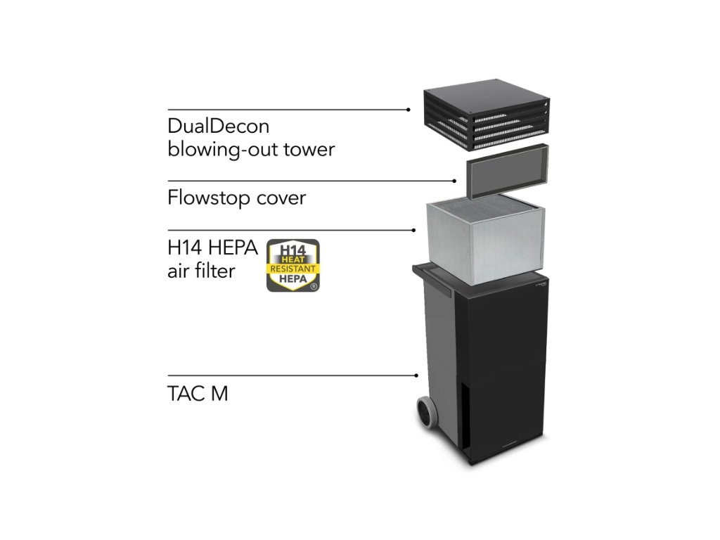Der Zonen-Luftreiniger TAC M II ist eine innovative Lösung zur Etablierung viren- und schadstoffarmer Reinluftzonen, wo immer diese benötigt werden – Stromanschluss genügt. Dort, wo dieser mobil einsetzbare Luftreiniger platziert wird, schafft er je nach benötigter Luftwechselrate eine mit sauberer, gefilterter Reinluft durchspülte „Clean-Zone-Area“ von bis zu 320 Kubikmetern Volumen.