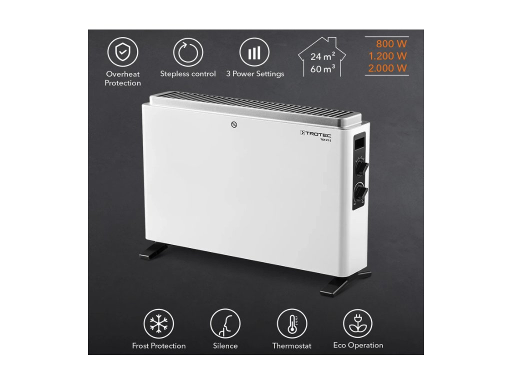 Wie alle Konvektoren der TCH‑E‑Serie arbeitet auch der TCH 21 E mit dem Effekt der gleichmäßigen Konvektionswärme. Die Raumluft wird im Gerät durch elektrisch aufgeheizte Drähte erwärmt und steigt infolgedessen als Warmluft nach oben, wodurch ein natürlicher Sog entsteht, der kalte Raumluft in das Gerät nachziehen lässt. Auf diese Weise entsteht eine stete Zirkulation warmer Luft im gesamten Raum, die in alle Winkel strömt. Die Wärme breitet sich überall gleichmäßig aus, eine Über- oder Unterbeheizung einzelner Bereiche wird somit optimal verhindert. Sobald der voreingestellte Wärmegrad erreicht ist, schaltet sich das Gerät ab und erst dann wieder ein, wenn ein Nachheizen des Raumes erforderlich wird um den Zielwert wieder zu erreichen. Das Ergebnis ist eine raumausfüllende Wohlfühlwärme – die aufgrund des elektrischen Heizelements zu 100 % sauber, kondensfrei und geruchlos ist.