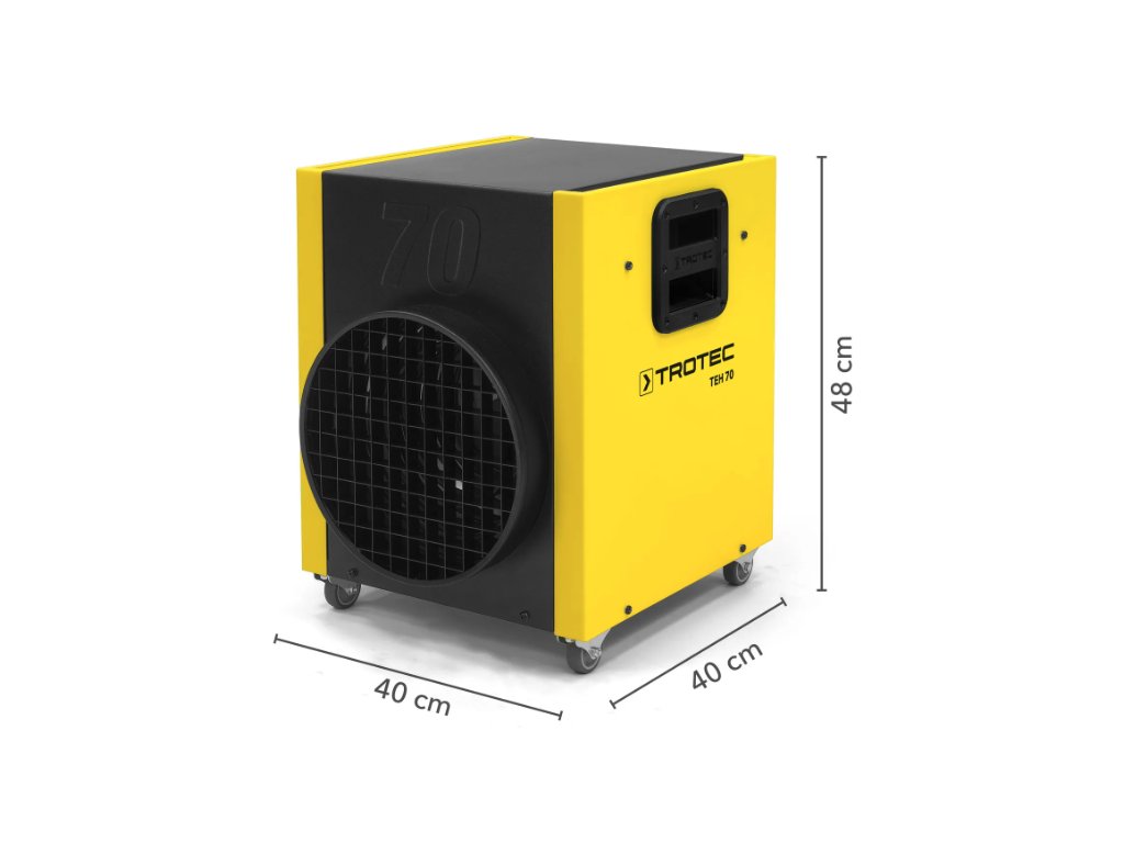 Seine widerstandsfähige Konstruktion und hochwertige Verarbeitung mit zahlreichen praxisorientierten Lösungsdetails macht den TEH 70 zur optimalen Beheizungslösung für Baustellen, Industrie und Landwirtschaft oder zur Beheizung unbelüfteter Räume mit kondensfrei erzeugter Wärme.