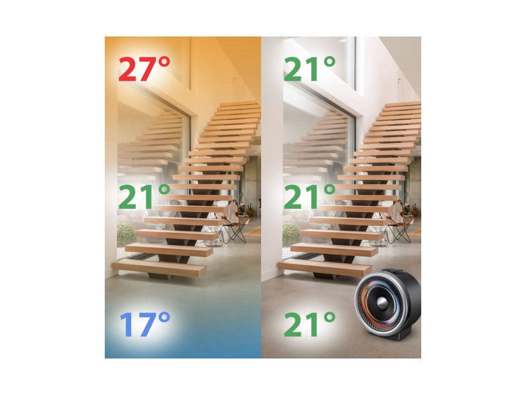 Kennen Sie das Problem? In Wohnungen mit hohen Decken, zugigen Stellen oder verwinkelten Räumen gelangt die warme Heizungsluft nicht in jeden Bereich des Raumes, sodass häufig unangenehm kühle Stellen bleiben. Dabei läuft die fest installierte Heizung auf vollen Touren und trotzdem frieren einem die Füße. Die Ursache für diese Temperaturschwankungen im Raum ist eine unzureichende Luftzirkulation. Die warme Heizungsluft gelangt gar nicht erst auf den Boden, sondern steigt nach oben an die Decke, kühlt dort ab und mit zunehmender Entfernung zum Heizkörper sinkt auch die Raumtemperatur. Eine raumausfüllende Verteilung der warmen Luft findet nicht statt.