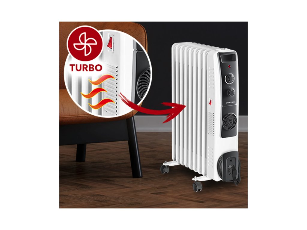 Besonders schnell warm wird es mit der zusätzlichen Turbogebläse-Unterstützung des Heizgerätes. Da Ölradiatoren im Vergleich zu Heizlüftern bei der Inbetriebnahme ca. 8 bis 10 Minuten benötigen, bis sie die volle Wärmeleistung abgeben, verfügt das Gerät TRH 22 E über ein keramisches PTC-Heizelement mit Turboventilator, das den Raum vorab in Windeseile erwärmt. So können Sie bereits warme Luft genießen, bevor der Radiator seine volle Heizleistung entfaltet.