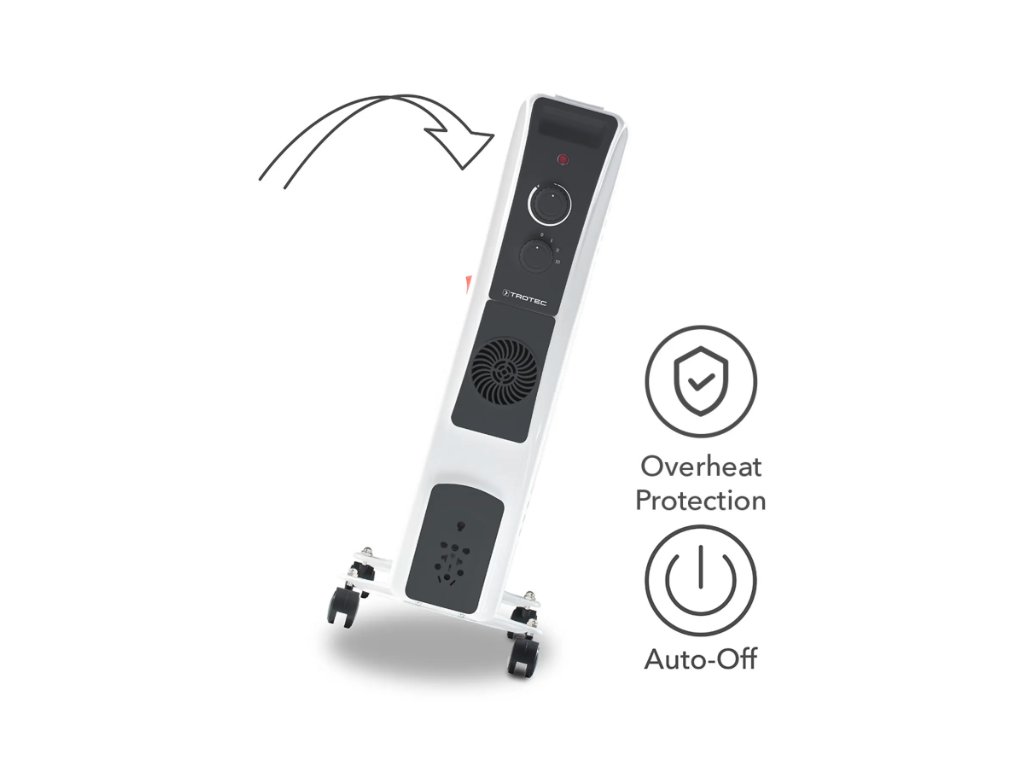 Ein Sicherheitsthermostat verhindert darüber hinaus zuverlässig das Überschreiten der Betriebstemperatur, was beispielsweise dann eintreten kann, wenn der Heizkörper durch Jacken oder andere Kleidungsstücke verdeckt wird. In diesem Fall sorgt der Überhitzungsschutz für eine sofortige Geräteabschaltung.