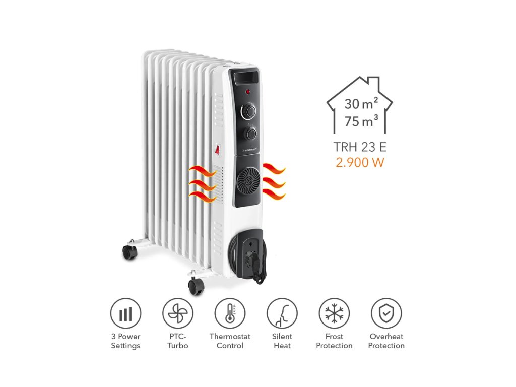 Mit seinem 3-stufig regelbaren Heizleistung liefert der TRH 23 E thermostatgesteuerte Temperaturen im Bereich von 10 - 35 °C. Der Ölradiator arbeitet ohne zugeschalteten Ventilator vollkommen lautlos, geruchlos und ohne Staub aufzuwirbeln und eignen sich daher auch gut für den Einsatz in Allergikerhaushalten oder im Schlafzimmer.