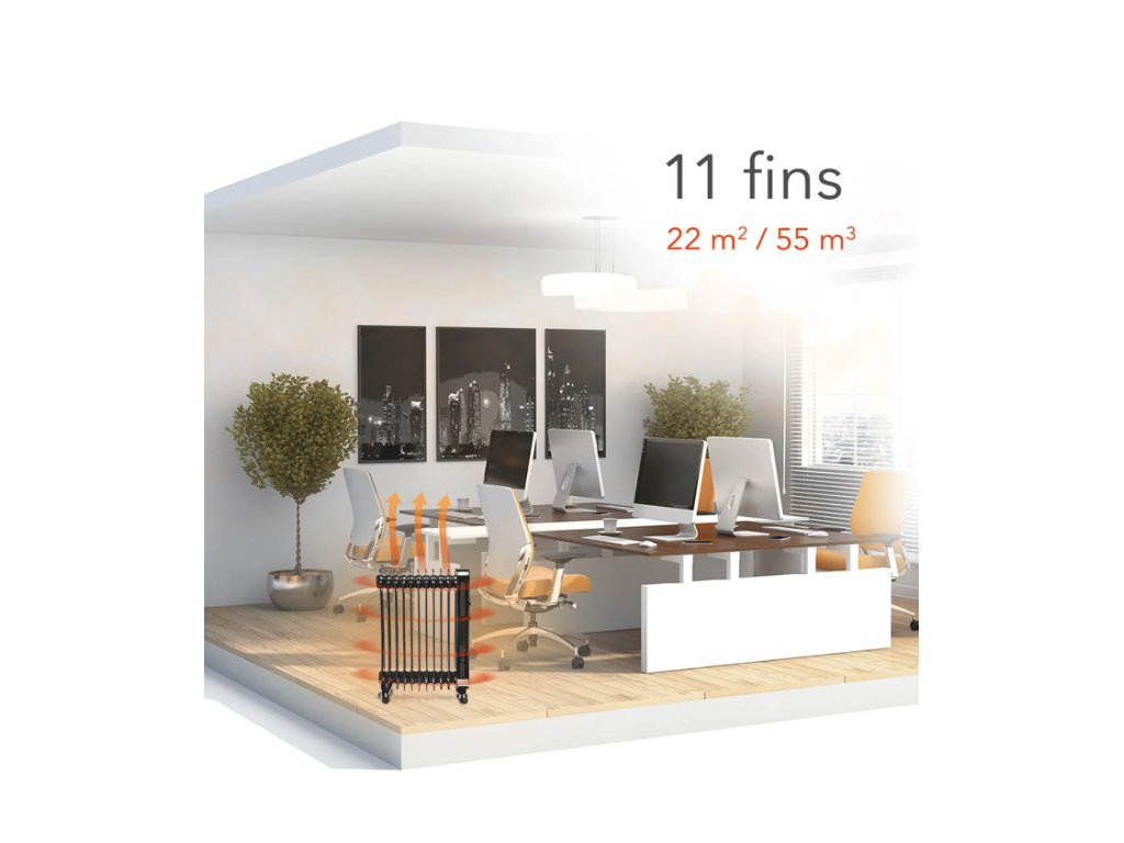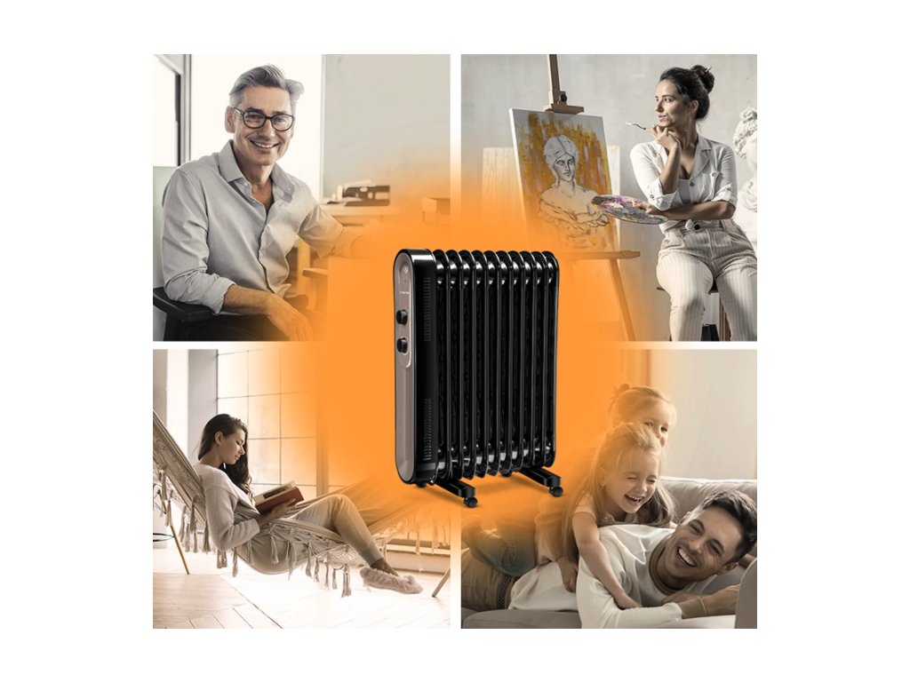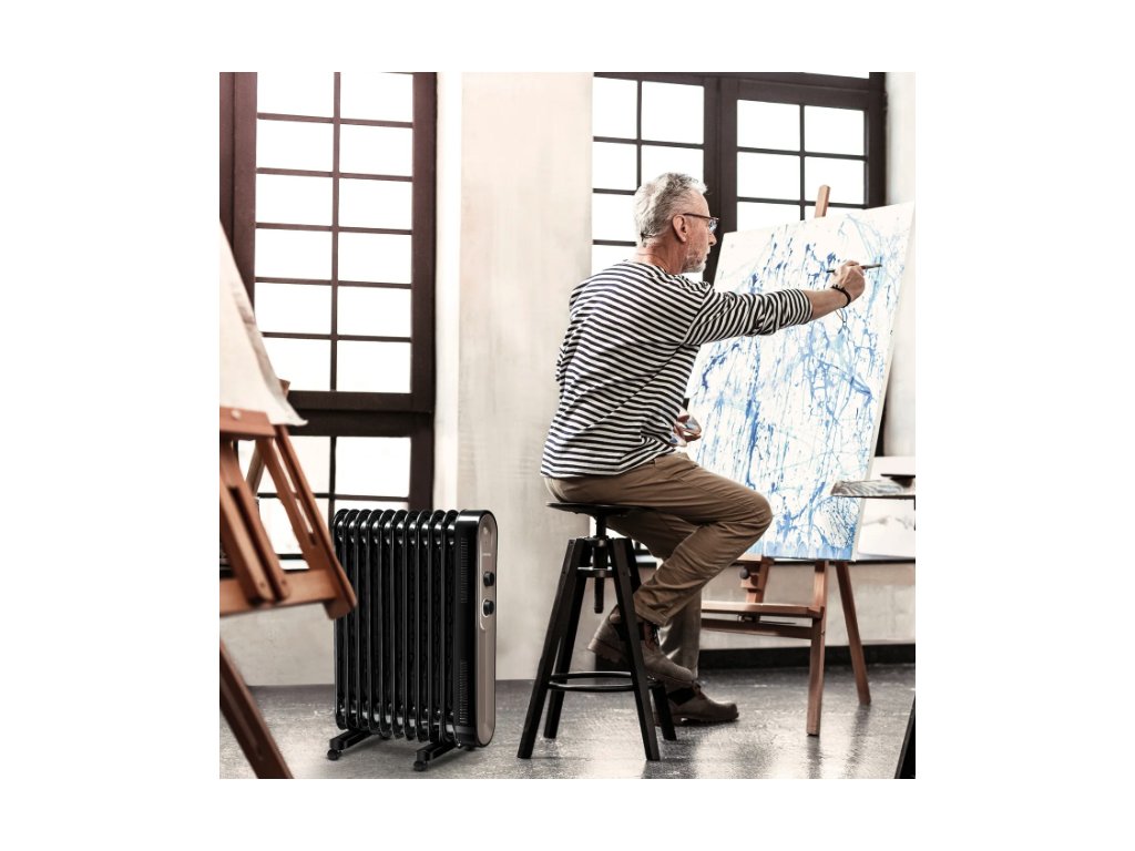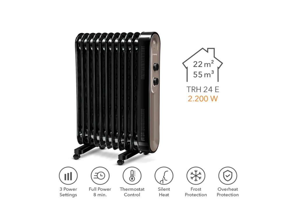 Der elegant schwarze Ölradiator TRH 24 E ist ein echter Charmeur. Immer sofort zur Stelle, wenn Sie das Bedürfnis nach zusätzlicher Wärme überkommt – beispielsweise an kühleren Tagen außerhalb der Heizperiode oder in der Übergangszeit zum kühlen Herbst/Winter. Bereits nach 8 Minuten Aufheizzeit verströmt der formschöne Radiator seine maximale Wärmeleistung und sorgt so vergleichsweise schnell für konstant warme Temperaturen in Räumen bis zu 22 m² bzw. 55 m³.