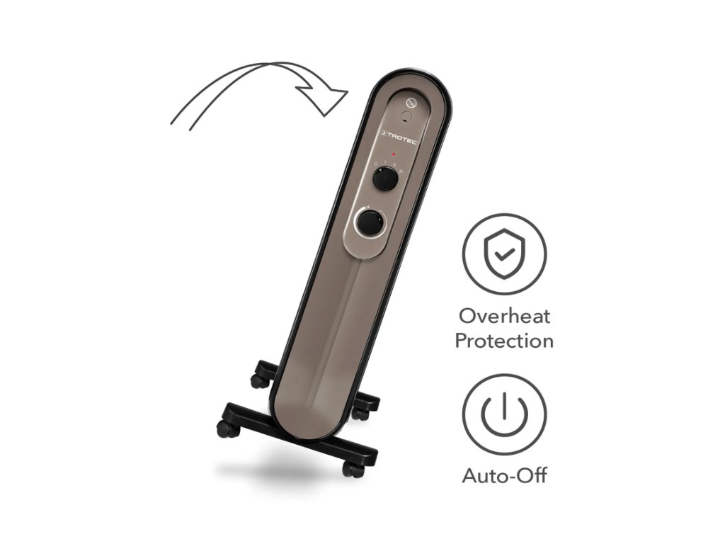 Ob herumtollende Kinder, spielende Haustiere oder unachtsame Gäste – den TRH 24 E mit breit ausgelegten Laufrollen im Standfuß wirft so schnell nichts aus der Bahn. Sollte der Ölradiator im Eifer des Gefechtes doch einmal ins Wanken geraten, dann schaltet der eingebaute Kipp-Abschalter das Heizgerät vollautomatisch aus. Darüber hinaus verhindert ein Sicherheitsthermostat das Überschreiten der Betriebstemperatur und somit eine Geräteüberhitzung – beispielsweise durch auf dem Radiator abgelegte Kleidungsstücke. Auch in solchen Situationen sorgt der Überhitzungsschutz für eine sofortige Geräteabschaltung.