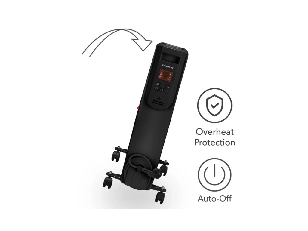 Ob spielende Kinder, übermütige Haustiere oder unachtsame Gäste: Den TRH 25 E wirft so schnell nichts aus der Bahn. Dafür sorgen breit ausgelegte Leichtlaufrollen, die einen sicheren Gerätestand garantieren. Im unwahrscheinlichen Fall, dass der Radiator doch einmal ins Wanken gerät, deaktiviert ein integrierter Kipp-Abschalter das Gerät automatisch. Zusätzlich verhindert ein Sicherheitsthermostat das Überschreiten der Betriebstemperatur, was beispielsweise dann passieren kann, wenn unachtsam abgelegte Kleidungsstücke das Heizgerät verdecken.