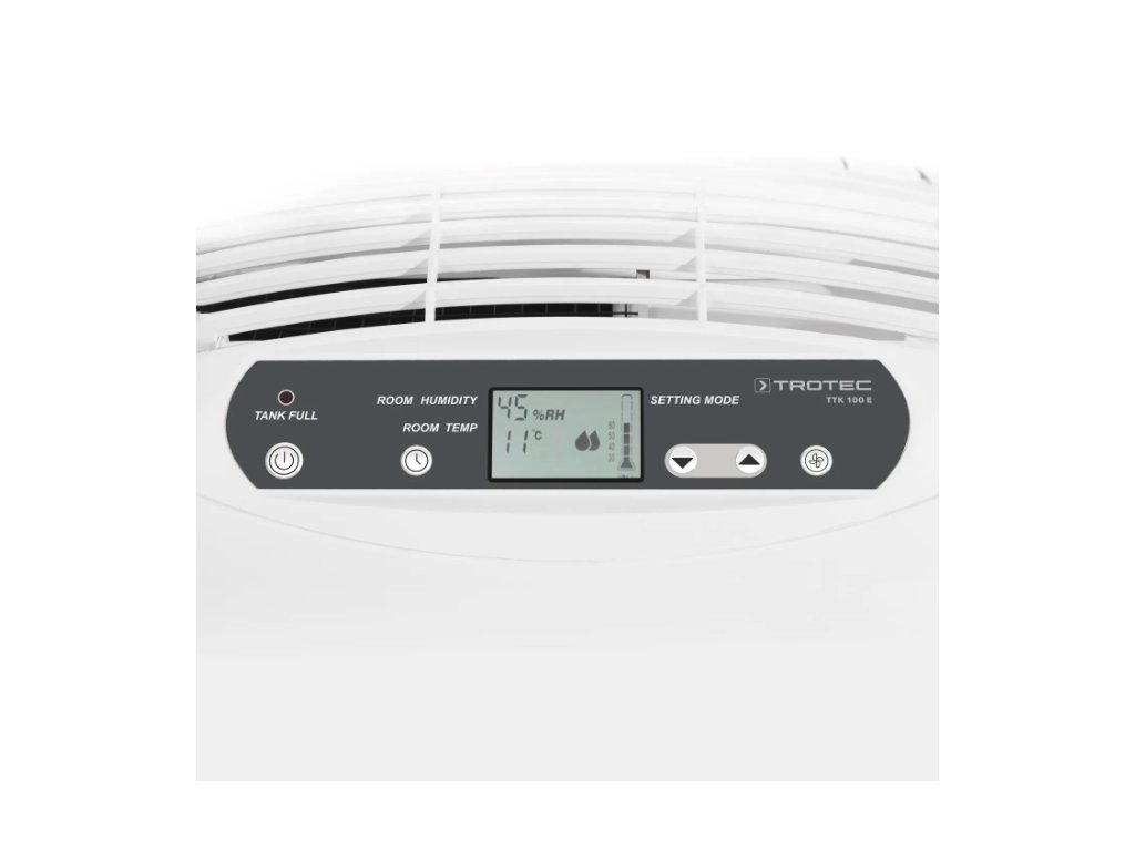 Gegenüber Luftentfeuchtern mit analogen Reglern zur einheitenlosen Vorwahl von Minimum- bis Maximumbetrieb können Sie beim TTK 100 E direkt den gewünschten Luftfeuchtewert über das Digitaldisplay eingeben. Ein integrierter Hygrostat setzt diese Zielvorgabe dann vollautomatisch um und reguliert selbsttätig die Leistung von Kompressor und zweistufigem Gebläse.