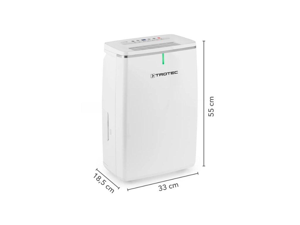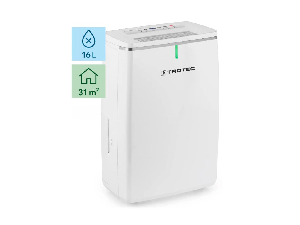 Dank seines funktionalen Designs passt sich der TTK 53 E flexibel an jedweden Einrichtungsstil an und hält dabei mit 2 Gebläsestufen und einer Entfeuchtungsleistung von bis zu 16 Litern pro Tag beheizte Räume bis 31 m² zuverlässig trocken. Dabei stehen auf dem pflegeleichten Bedientableau inklusive Digital-Display folgende Luftentfeuchtungs-Modi zur Wahl: der Automatikbetrieb mit einer voreingestellten Luftfeuchte von 55 %, hygrostatgesteuerte Entfeuchtungsautomatik mit Zielwertvorwahl zwischen 30 und 80 % r.F. in 5 %-Schritten, der Permanentbetrieb sowie die Ventilationsfunktion. Auf dem Display wird Ihnen unter anderem die aktuelle relative Luftfeuchtigkeit im Raum angezeigt.