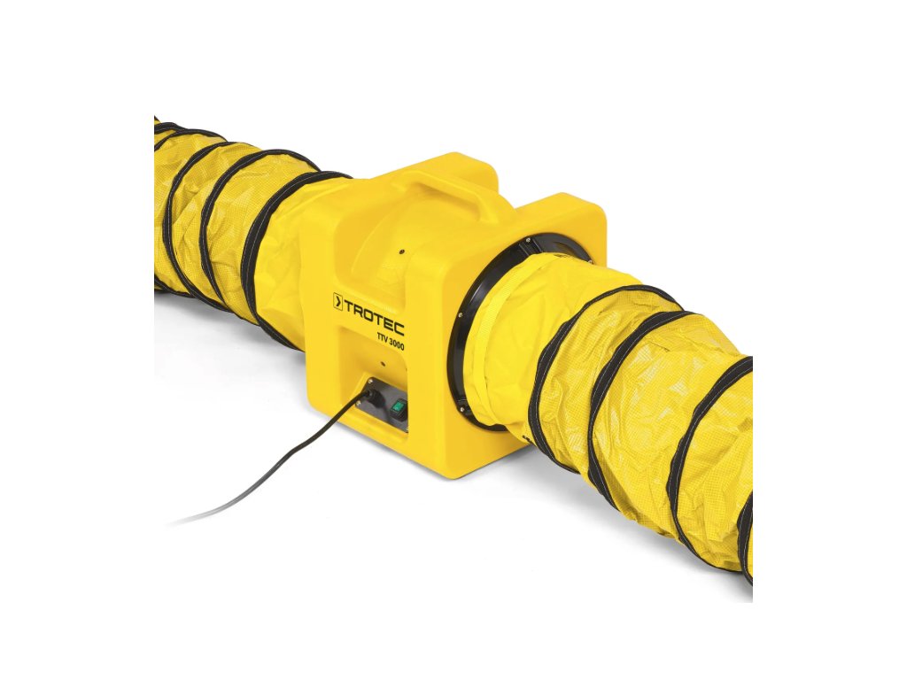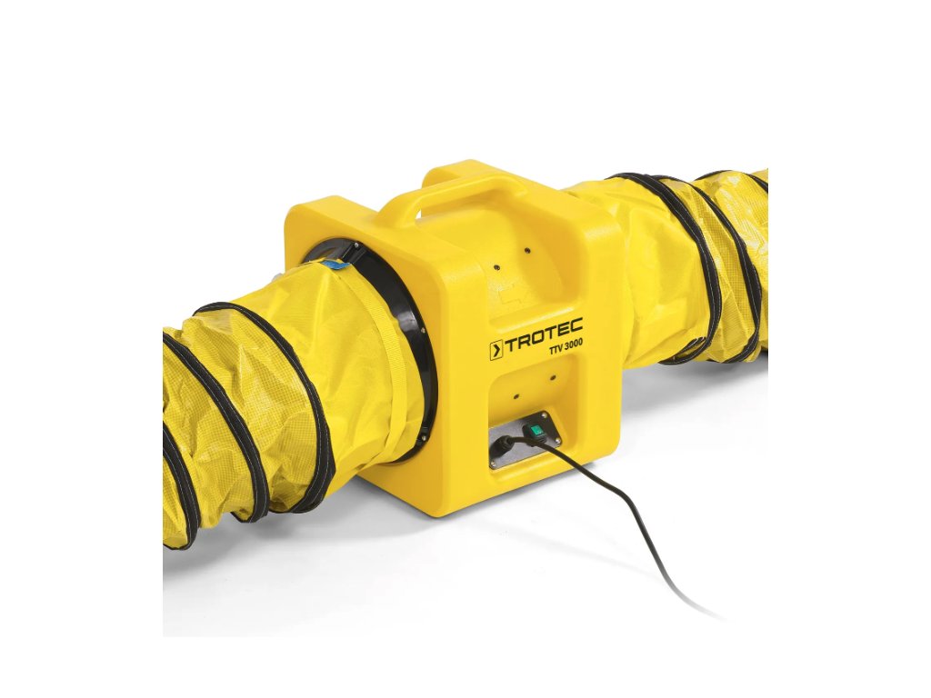 Bis zu 38 Meter lange Schläuche können flexibel an der Ausblas- oder Ansaugseite des TTV 3000 befestigt werden, denn dieser Axialventilator ist beidseitig mit entsprechenden Anschlüssen ausgestattet. Das ermöglicht nicht nur einen kombinierten Einsatz von ausblasseitigem Staubsack und ansaugseitig angeschlossenem Luftschlauch, sondern macht den TTV 3000 auch zum optimalen Transportlüfter bei weit verschlauchten mobilen Klimatisierungs- oder Beheizungseinsätzen.