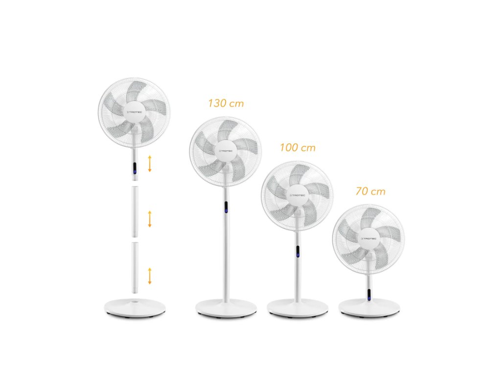 Die Gerätehöhe ist über das praktische Stangensystem dreistufig auf 1,3 Meter, 1 Meter oder nur 70 cm einstellbar. Bis zu zwei Mittelstangen lassen sich im Handumdrehen entfernen, um das Standgerät sogar in einen Tischventilator zu verwandeln. In der höchsten Einstellung (1,3 Meter) eignet sich der Ventilator besonders gut, um frische Luft großflächig im Raum zu verteilen. Mit der mittleren Einstellung (1 Meter) lässt sich der Luftstrom optimal für sitzende Personen ausrichten. Und in der kleinsten Einstellung (70 cm) präsentiert sich der variable TVE 24 S als stilvoller Tischventilator auf Ihrem Schreib- oder Esstisch.