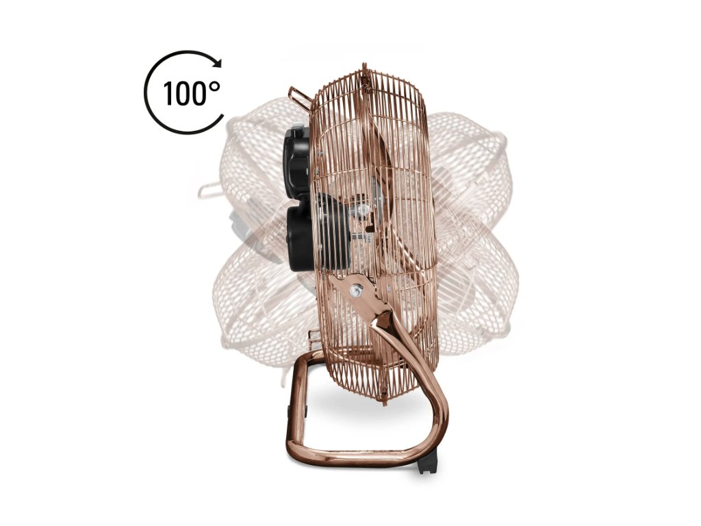 Der kompakte TVM 13 benötigt auf dem Boden nur wenig Platz und ist auf einen Wechsel des Einsatzortes bestens vorbereitet – ein hinten angebrachter Tragegriff sowie die Kabelaufwicklung machen den Transport des Bodenventilators so bequem wie möglich. Auch den einen oder anderen Schubser steckt der Bodenventilator problemlos weg – drei an der Unterseite des ebenfalls kupfernen Standbügels angebrachte rutschhemmende Gummifüße sorgen für den sicheren Stand des Gerätes.