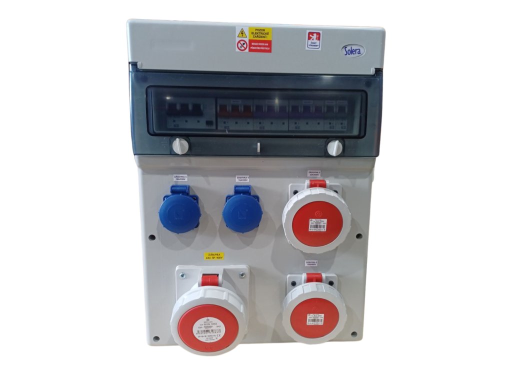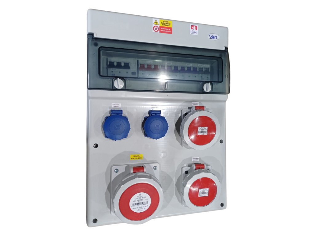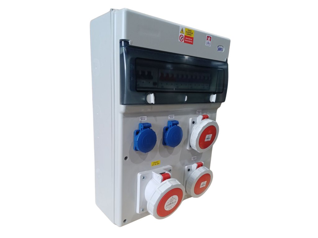 Professionelle Steckdosenverteilbox mit Fehlerstromschutzschalter (RCD), ausgelegt für die sichere Verteilung elektrischer Energie in der Industrie, auf Baustellen und beim Betrieb mit Stromerzeugern. Robuste Ausführung, übersichtliche Absicherung und eine Kombination aus 230-V- und 400-V-Steckdosen.